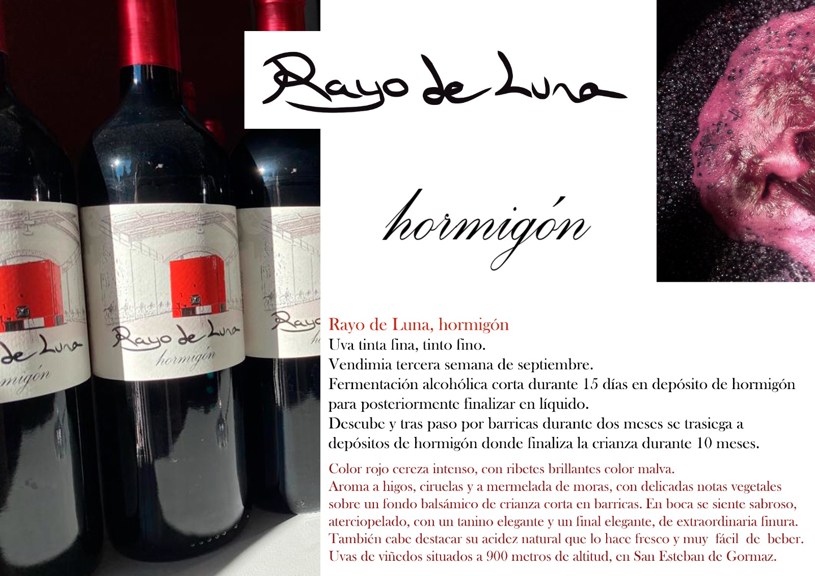 Color rojo cereza intenso, con ribetes brillantes color malva. Aroma a higos, ciruelas y a mermelada de moras, con delicadas notas vegetales sobre un fondo balsámico de crianza corta en barrica. En boca se siente sabroso, aterciopelado, con un tanino elegante y un final elegante, de extraordinaria finura. También cabe destacar su acidez natural que lo hace fresco y muy fácil de beber. Uvas de viñedos situados a 900 metros de altitud, en San Esteban de Gormaz.